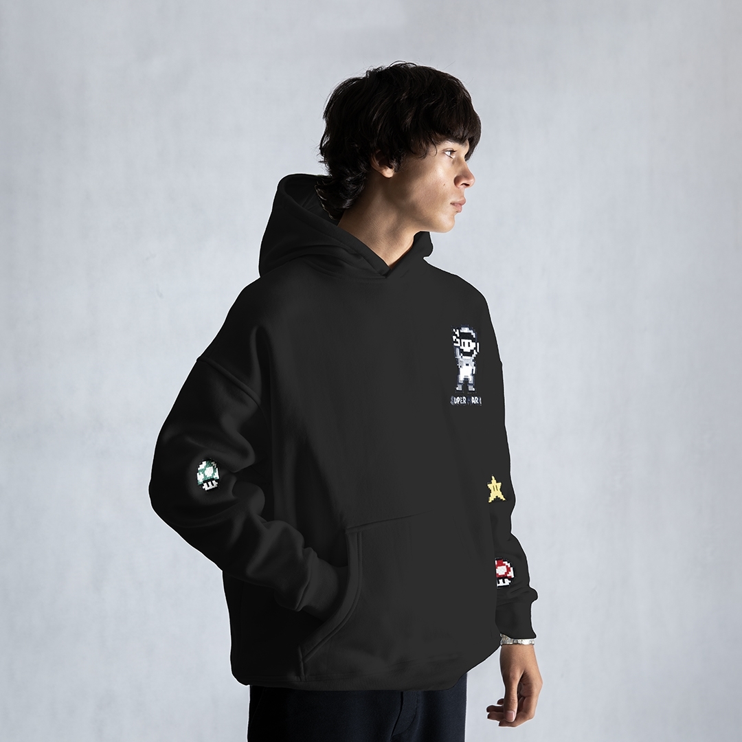 طراحی این هودی با استفاده از گلدوزیهای دقیق و باکیفیت انجام شده؛ روی سینه شخصیت پیکسلی سوپر ماریو به چشم میخورد و روی آستینها نیز جزئیات نمادین از دنیای ماریو مانند پوسته لاکپشت و دیگر المانهای آشنا دیده میشود. این ظرافت در طراحی باعث شده هودی سوپر ماریو نه تنها یک لباس راحتی باشد، بلکه به یک اثر هنری پوشیدنی تبدیل شود.
